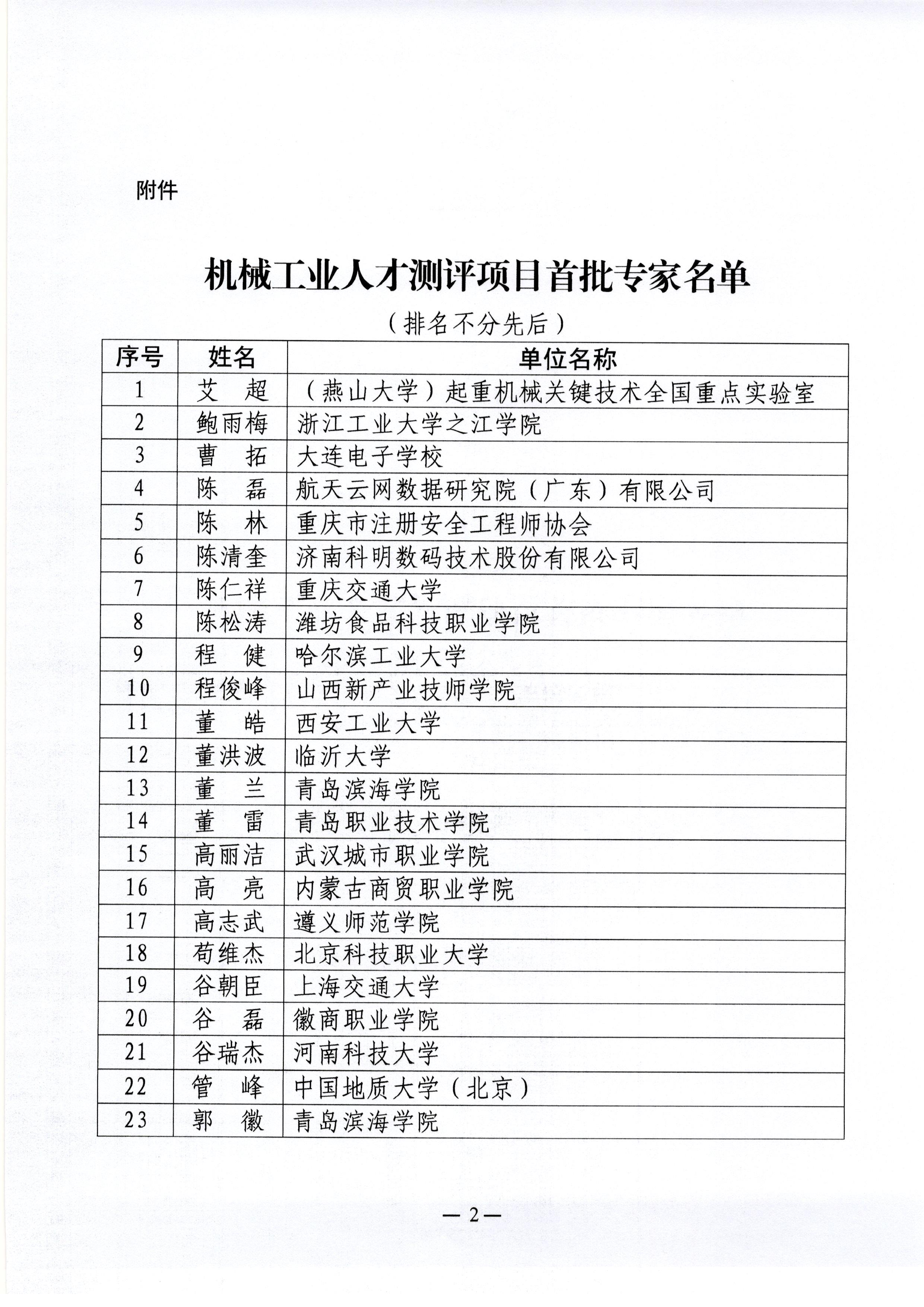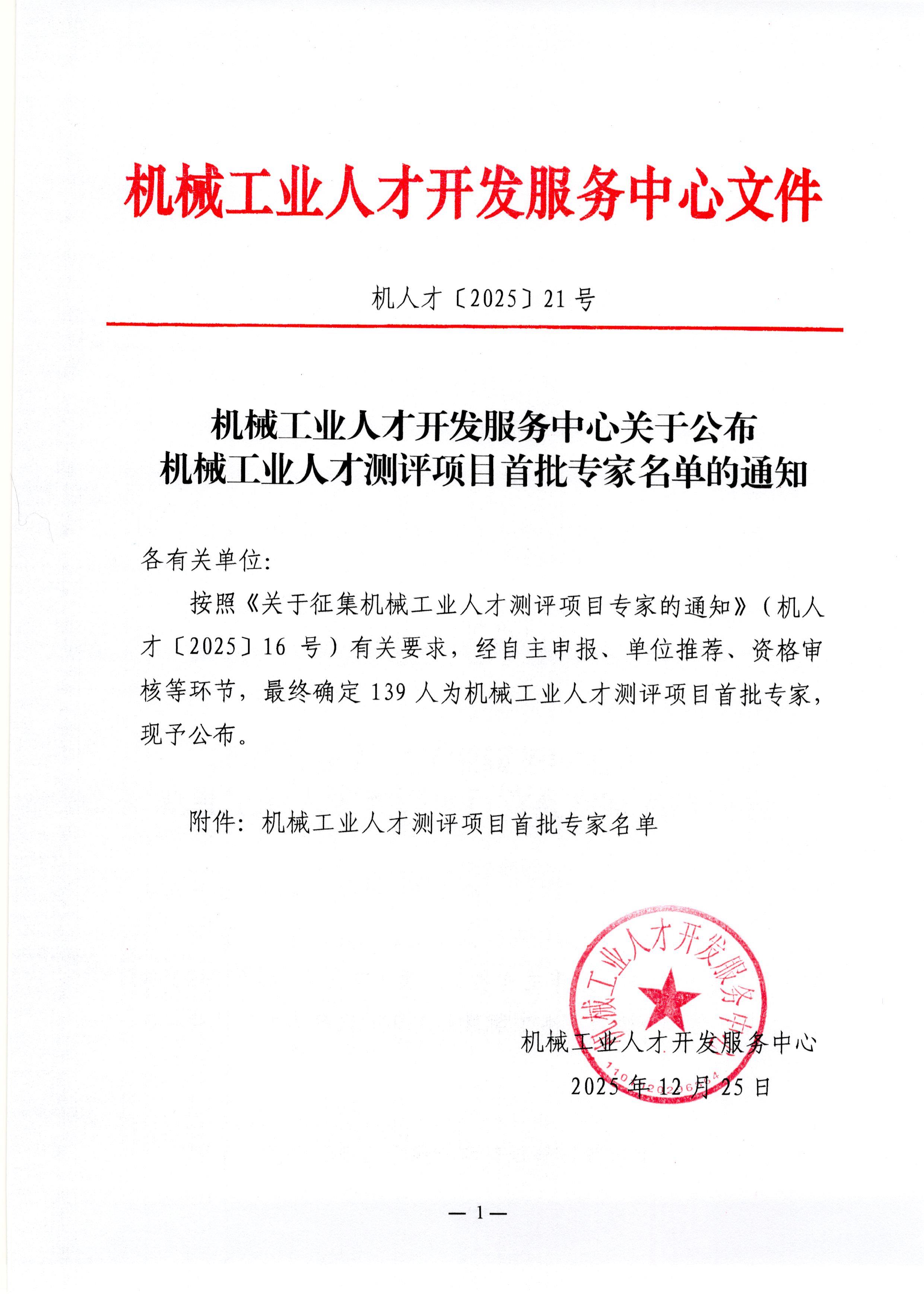 机械工业人才开发服务中心关于公布机械工业人才测评项目首批专家名单的通知